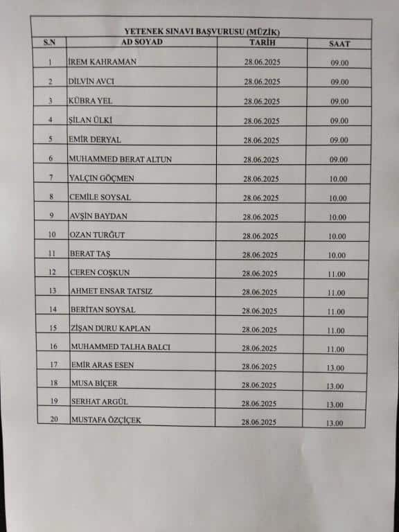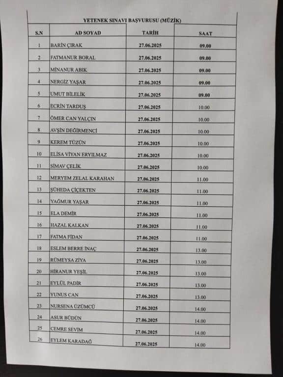 2025-2026 Eğitim Öğretim yılı için müzik alanında özel yetenek sınavı ile okulumuza öğrenci alınacaktır. Bunun için 27-28 Haziran 2025 tarihinde saat 09:00'da aşağıdaki listede ismi geçen öğrencilerin belirtilen tarih ve saatte okulda hazır bulunmaları gerekmektedir.