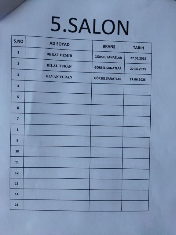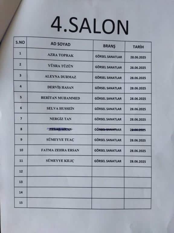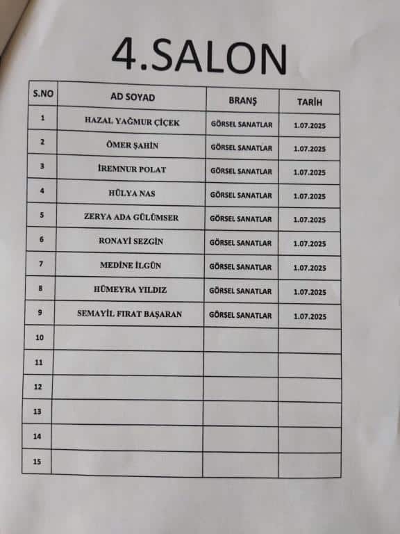 2025-2026 Eğitim Öğretim yılı için resim alanında özel yetenek sınavı ile okulumuza öğrenci alınacaktır. Bunun için 27-28 Haziran 2025 ile 01.07.2025 tarihinde saat 10:00'da aşağıdaki listede ismi geçen öğrencilerin belirtilen tarih ve saatte okulda hazır bulunmaları gerekmektedir.